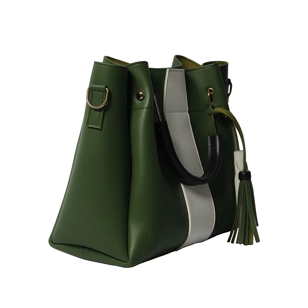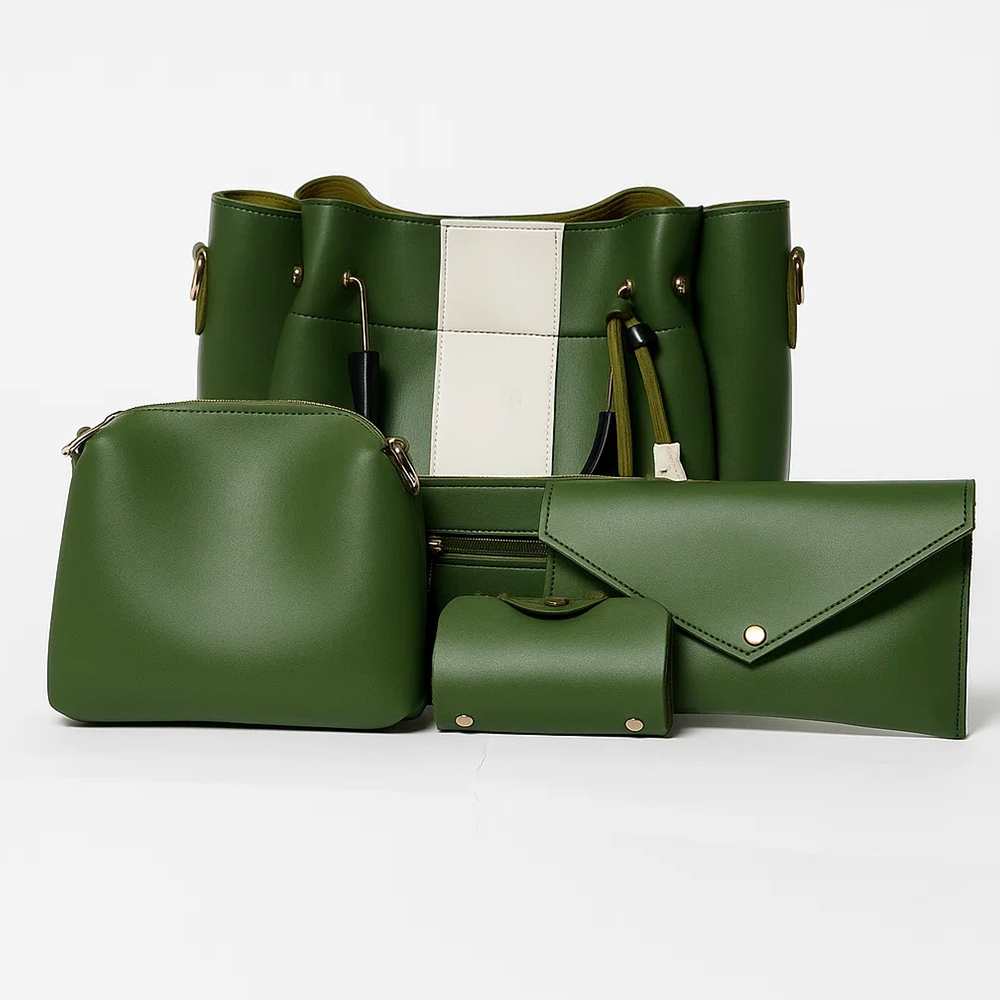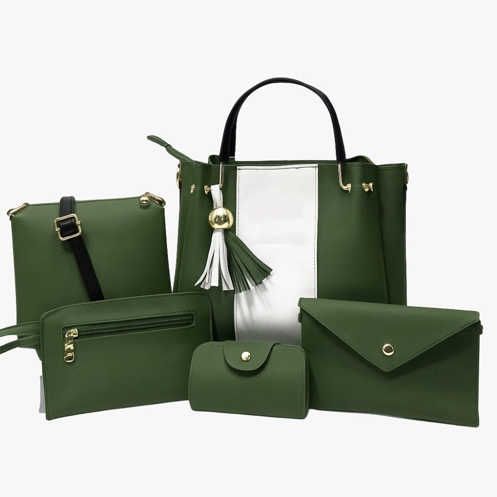 Women Fashion 5 piece Bag set, in two color tones, pushes our Alpha series to the next level. With this collection you find the ideal combination of style and functionality. This set of Hand Bags is made to cater to all your requirements. Just Like the Alpha series, this set also comes with a stylish shoulder bag, a small hand pouch featuring a gold metal chain, and a large makeup pouch to store your necessities separately. These bags are made of high-grade PU leather. This makes them easy to clean and serves you for a long time. They feature a strong handle, ornamental tassel, and a slender metal cum leather handle, the bags bring sophistication to any dress code. Comes in 7 beautiful colors, the ultimate set is ideal for daily wear or special events.